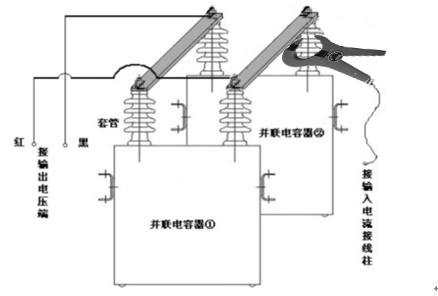 (4)將測(cè)試電壓電纜分別夾在被試電容器組兩極的連接母線上,鉗形電流取樣表卡在所需測(cè)量的單臺(tái)電容器的套管處;
