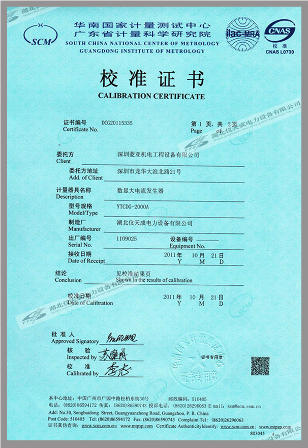 YTCDG系列大電流發(fā)生器鑒定證書